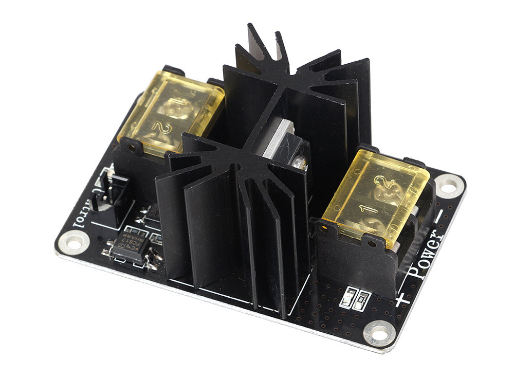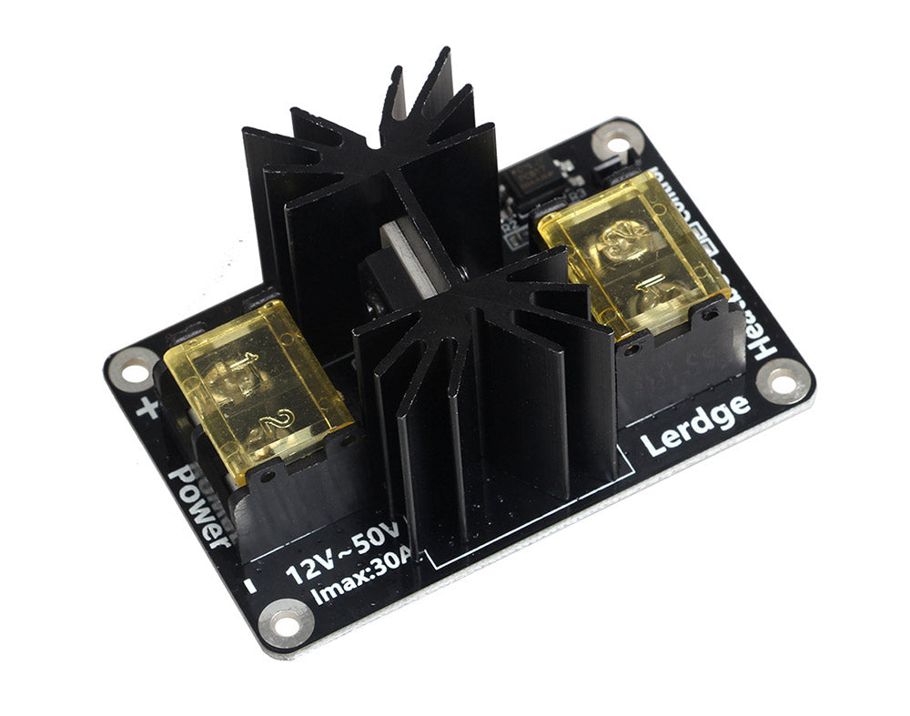 Lerdge heated bed high-power expansion module, with unique snowflake heatsink design, has a great cooling effect. This high power module helps your 3D printer equipped with the Lerdge board become even more powerful. The module can solve the current load problem when the heated bed power is too large. Under the normal heat dissipation, the module can be stable long-term work when measured I (Max) = 30A. When using the module, the current should not exceed 30A.